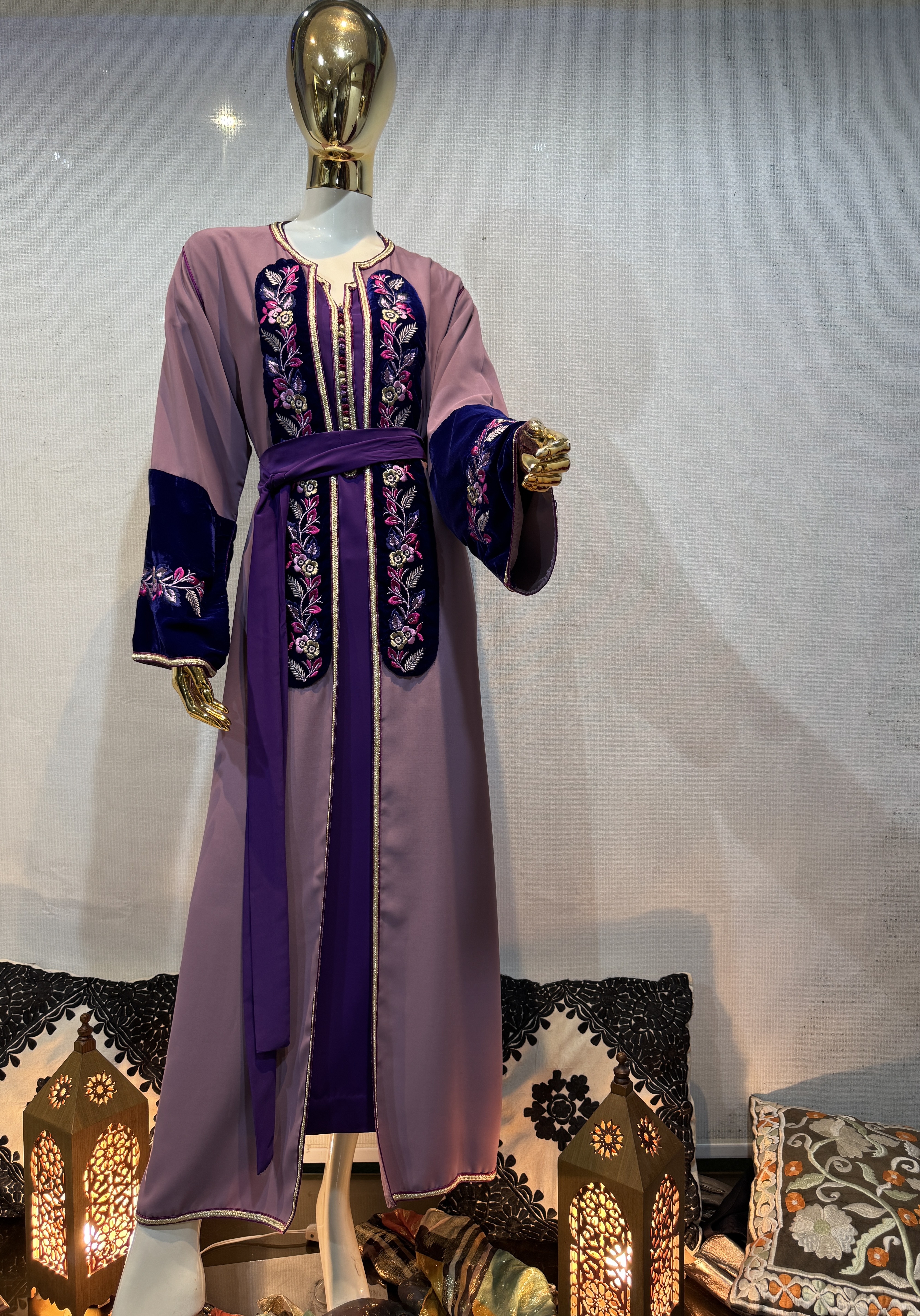 Chaque création est le fruit d'un dialogue entre tradition séculaire et vision contemporaine. Nos maâlems, gardiens d'un savoir-faire transmis de maître en apprenti, brodent à la main chaque arabesque, chaque motif floral, chaque fil d'or — faisant de chaque caftan une œuvre unique et intemporelle.